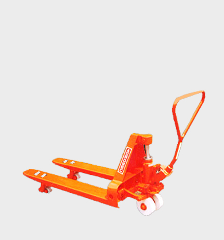 Agromec manufactures Hydraulic Handlift Pallet trucks in standard capacities of 1.1, 2, 2.5 & 3.2 Tons and standard fork length of 900 mm, 1050 mm and 1220 mm. The Minimum pallet gap varies from 65 to 100 mm. For special applications, pallet trucks can be tailor-made to suit customer's requirement of capacities up to 10 Tons, fork lengths up to 1650 mm. And pallet gap up to 250 mm and even more. The Ram and plunger used in hydraulic unit are hard chrome plated and mirror finished. The cylinders are honed to high degree of finish. Lifting is done by swift and easy strokes of the steering handle and lowering by pressing a foot pedal. Cushioned lowering under Hydraulic pressure enables the trucks to handle all breakable parts & products. Each wheel is provided with two antifriction reputed make Bearings. Ball thrust and oil cushioned steering combined with wide dual steering wheels provides excellent, maneuverability in narrow ailes and restricted areas and easy steer with heavy loads. An ideal machine for internal handling of raw Materials, components and finished products from store to shop floor, from machine to machine, from one bay to another, ultimately to loading/unloading platform and vice-versa, completely a one man show on smooth level pucca floors. Hydraulic unit has few working parts, for easy maintenance and long life. Parts are interchangeable and available off the shelf.